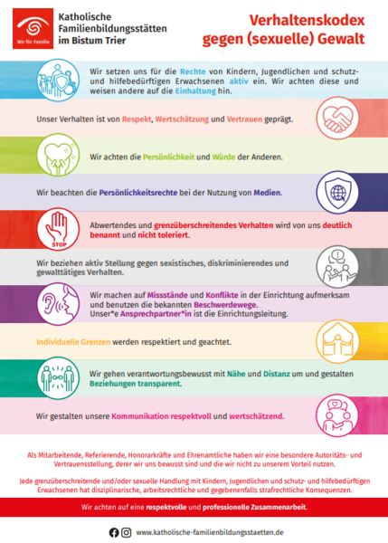 „Der Verhaltenskodex gegen (sexuelle) Gewalt“ und „Unsere Werte“ sind verbindliche Handlungs- und Verhaltensmaxime und gelten für alle Menschen, die unser Haus besuchen, an unseren Kursen und Veranstaltungen teilnehmen oder mit uns zusammenarbeiten.